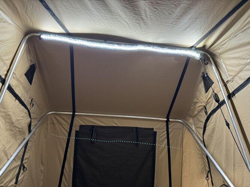 The roof tent lamp has a 120cm long LED strip that is attached to the inside of the tent using Velcro. With a 5m long connection cable, the lamp can be operated using a cigarette lighter or a battery (12 V). It also offers three different color variants.